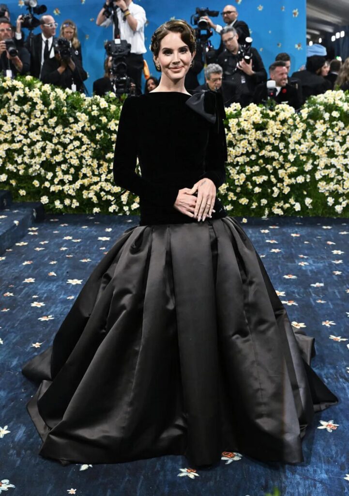 Lana Del Rey, “Valentino” markasının Alessandru Mikele tərəfindən dizayn edilmiş teatrallıq və zərifliyi birləşdirən libası ilə gecədə iştirak etdi. Qara məxmər və qəhvəyi atlasdan hazırlanmış libas dantel, tüklər və plisə ətəklə tamamlanmışdı. Onun qızıl alliqator formalı saç aksesuarı həyat yoldaşı Ceremi Düfrenəyə bir istinad idi. Bu, Del Reyin Met Qaladakı dördüncü çıxışı oldu.
