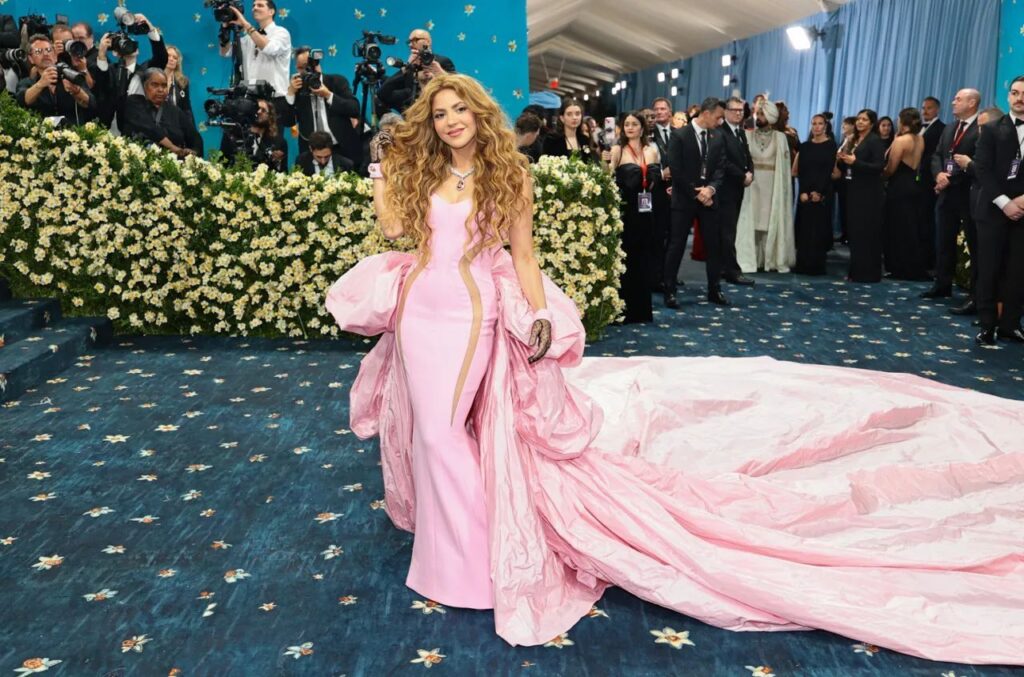 Şakira, Prabal Qurunq tərəfindən hazırlanmış parlaq çəhrayı paltarla qırmızı xalçaya çıxdı. Geyim mövzu ilə tam uyğun olmasa da, zərifliyi və şahzadə tərzi ilə fərqləndi. Kəsik detalları, iri kuşağı, şəffaf əlcəklər və daşlı boyunbağı ilə görünüş tamamlanmışdı. Rihanna ilə görüşündə Şakiranın təsadüfən onun hamilə olduğunu açıqlaması sosial mediada səs-küyə səbəb oldu.