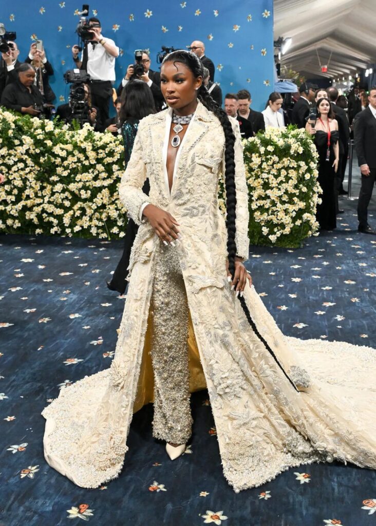 Çarli XCX, Ann Demölemeister imzalı, kəskin çiyinli pencək, şəffaf ətək və tüklü başlıqla “Brat” dövrünə uyğun sərt və fərdi üslubunu əks etdirdi. Qara rəngli bu gotik görünüş tədbirin mövzusuna tam uyğun gəlirdi. Tünd göz makiyajı, təbii dodaqlar və asimmetrik topuz saç düzümü ilə stilini tamamlayan sənətçi, Met Galada üçüncü çıxışını etdi.