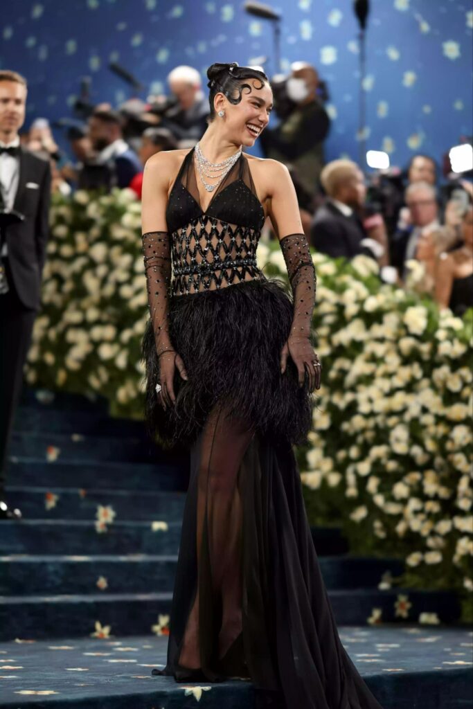 Dua Lipa, “Chanel”in 45.000-dən çox əl işi detalları olan şifon, tüvit və orqanza parçalı libası ilə qırmızı xalçada göründü. Geyim zərifliyi və incə işləmələri ilə onun dəb estetikasını ön plana çıxardı. Dua Lipa, aktyor Kallum Törnerlə birlikdə ilk dəfə cütlük kimi tədbirə qatılaraq diqqət mərkəzində oldu.
