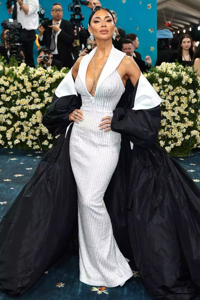 Nicole Şerzinger, Met Qala debütünü Prabal Gurung imzalı parlaq ağ zolaqlı libasla etdi. Jilet formasında başlayan və aşağıya doğru parıldayan zolaqlarla davam edən libas klassik Amerika siluetlərini və fərdi üslubu birləşdirirdi.