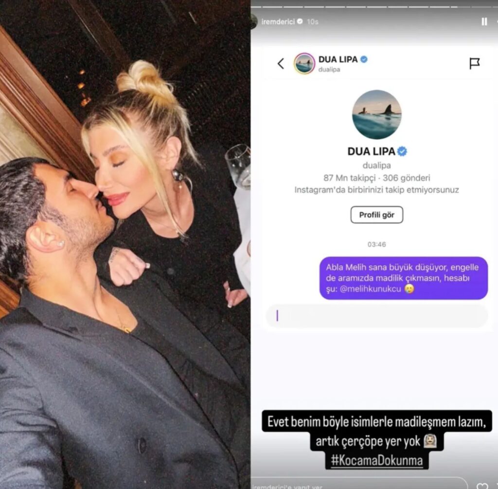 İnstagram üzərindən Dua Lipaya “Bacı, Melih sənə çox maraq göstərir, aramızda problem çıxmasın deyə onu blok et” mesajını göndərən İrem Derici, bu anı izləyiciləri ilə bölüşərək “Mən artıq belə məşhurlarla ünsiyyət qurmalıyam, çünki lazımsız insanlara yer yoxdur” sözlərini əlavə edib.