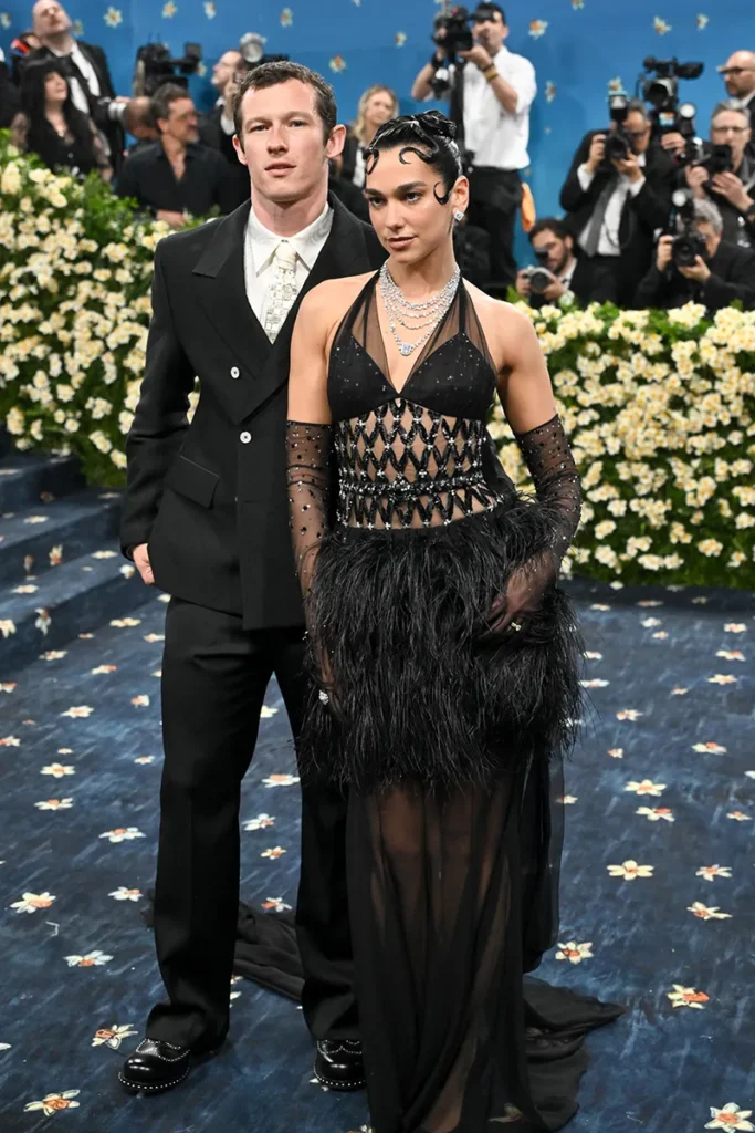 Dua Lipa və Kalum Turner–Dua Lipa bu il Met Qalaya qatılacğı libas seçimində yenə “Chanel”ə üz tutdu. Dua Lipa açıq şifon donla qara payetli gödəkçə və orqanza papaqla geyimini tamamlamışdı. Bütün bunlar lələklər, kristallar və mirvarilərlərlə bəzədilmişdi. Ümumilikdə, libasın ərsəyə gəlməsi 2000 saat çəkib. Bu, Kalum Turner və Dua Lipa cütlüyünün bir yerdə ilk kamerlar qarşısına çıxdığı gecə idi. Dua 2024-cü ilin iyulunda ingilis aktyorla görüşdüyünü təsdiqləmişdi. Kalum Turner isə sadə qalaraq qara kostyum, ağ köynək və zərli elementlərlə bəzədilmiş qalstukla gecədə bütün işıqları Dua Lipaya yönəltməyi bacarıb.
